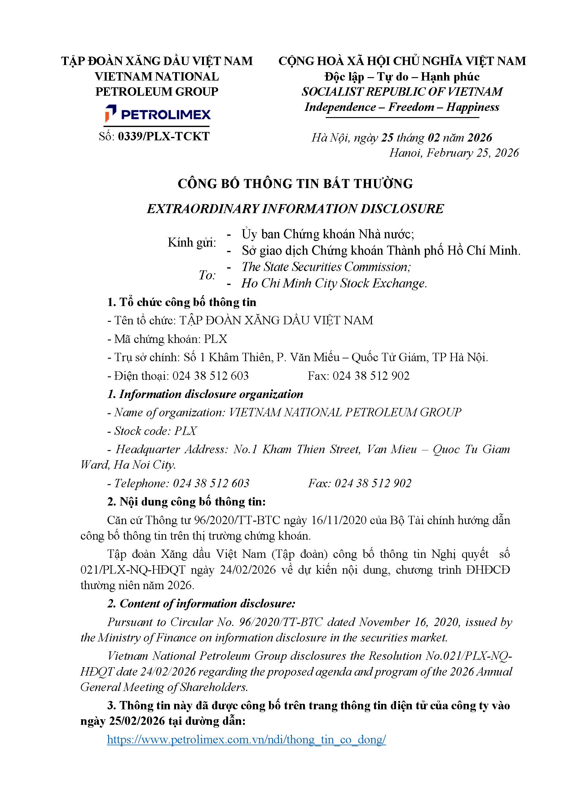Công bố thông tin Nghị quyết của HĐQT về dự kiến chương trình, nội dung ĐHĐCĐ thường niên năm 2026